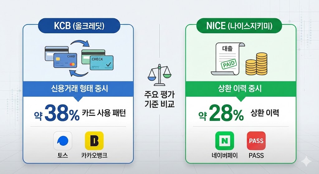 | 주요 관점 | 신용거래 형태 | 상환 이력 | KCB는 패턴, NICE는 갚은 기록 중시 |