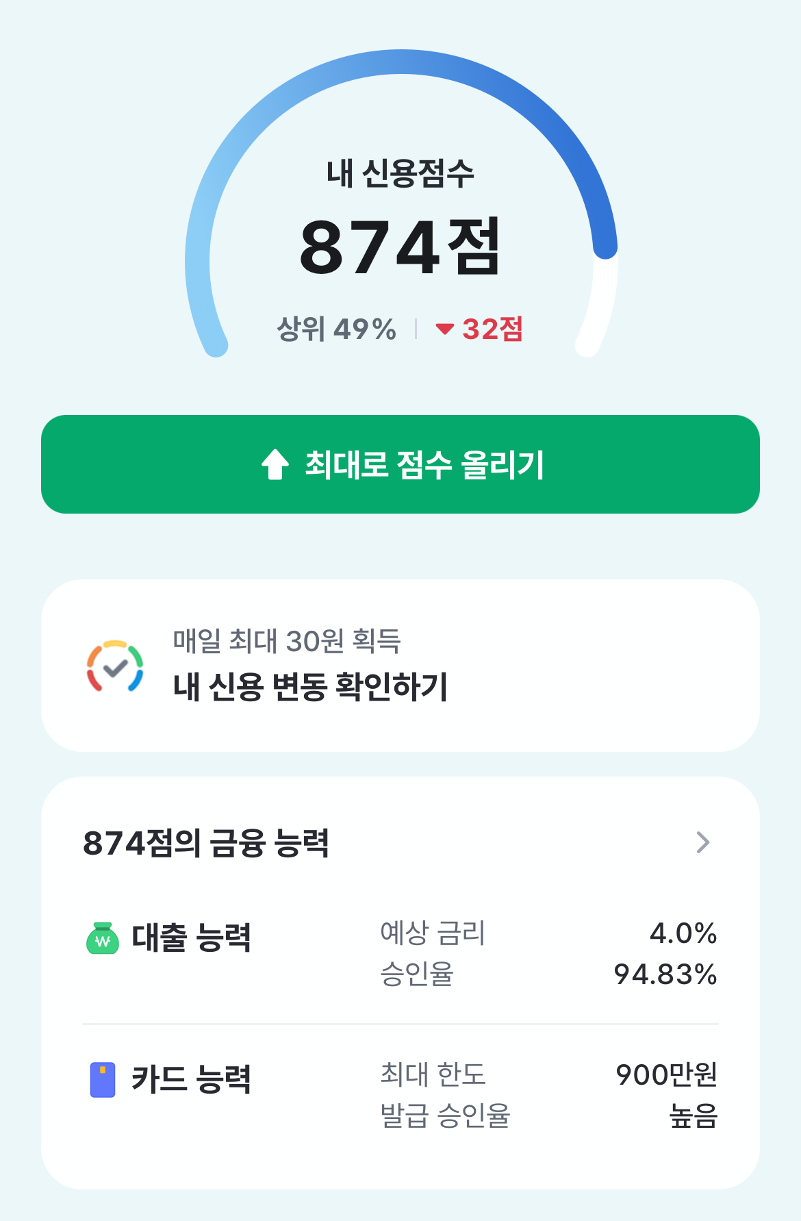 - 방법: 토스, 카카오뱅크, 네이버페이 등 앱 내 [신용점수 올리기] 버튼 클릭