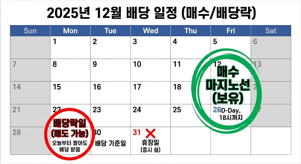 오늘은 2025년 연말 배당금을 받기 위한 매수 마지노선(D-Day)과 언제 팔아도 되는지(배당락일)를 캘린더로 확실하게 정리해 드립니다.